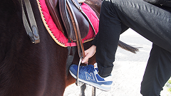 さっそく乗ってみましょう!サラブレッドは背が高いので踏み台を使って乗ります。2m30cmの高さは普段体験する事がないので、皆さん驚かれることが多いです。