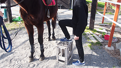 さっそく乗ってみましょう!サラブレッドは背が高いので踏み台を使って乗ります。2m30cmの高さは普段体験する事がないので、皆さん驚かれることが多いです。